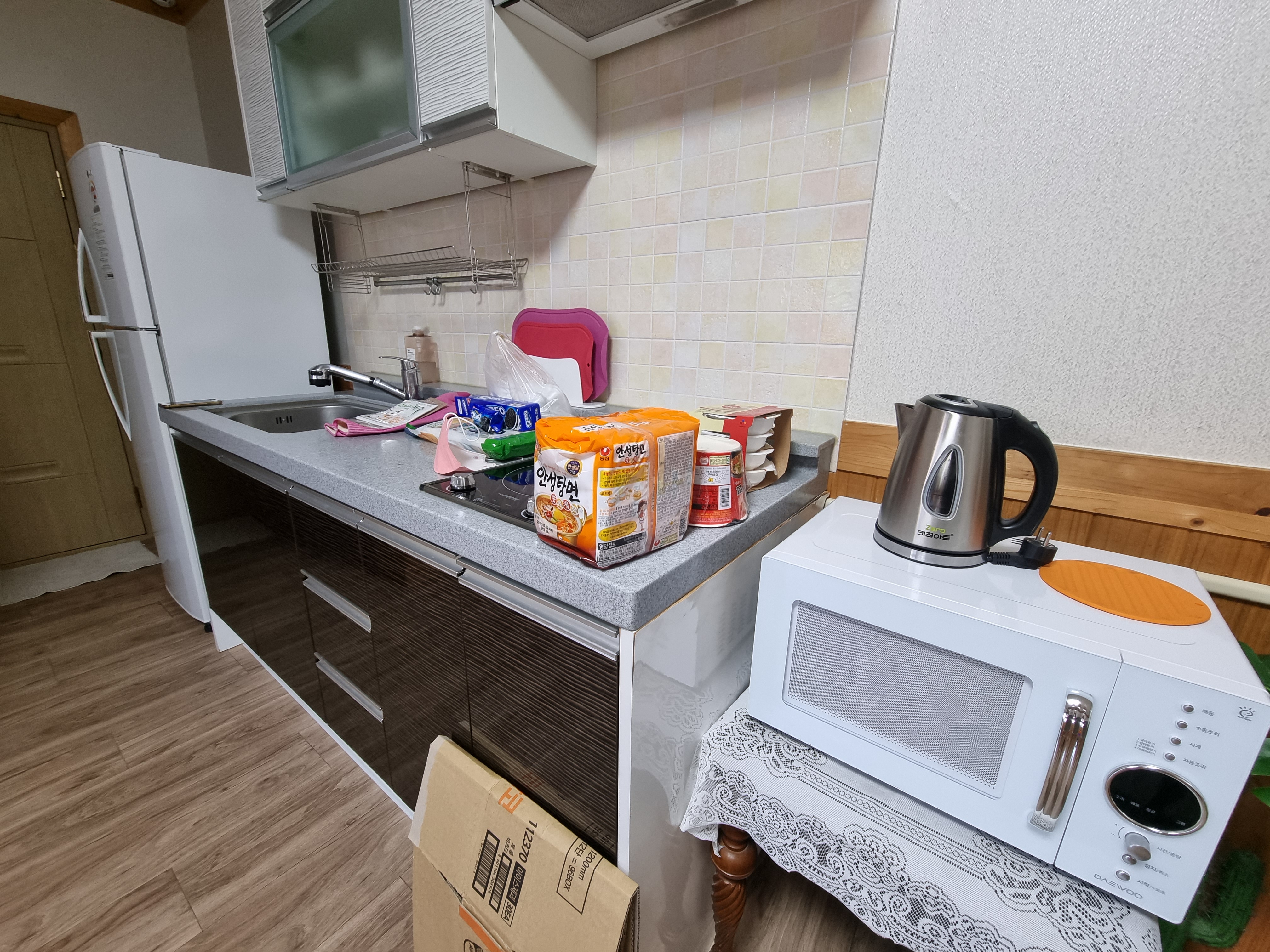 주방에 인덕션, 씽크대, 커피포트, 전자렌지