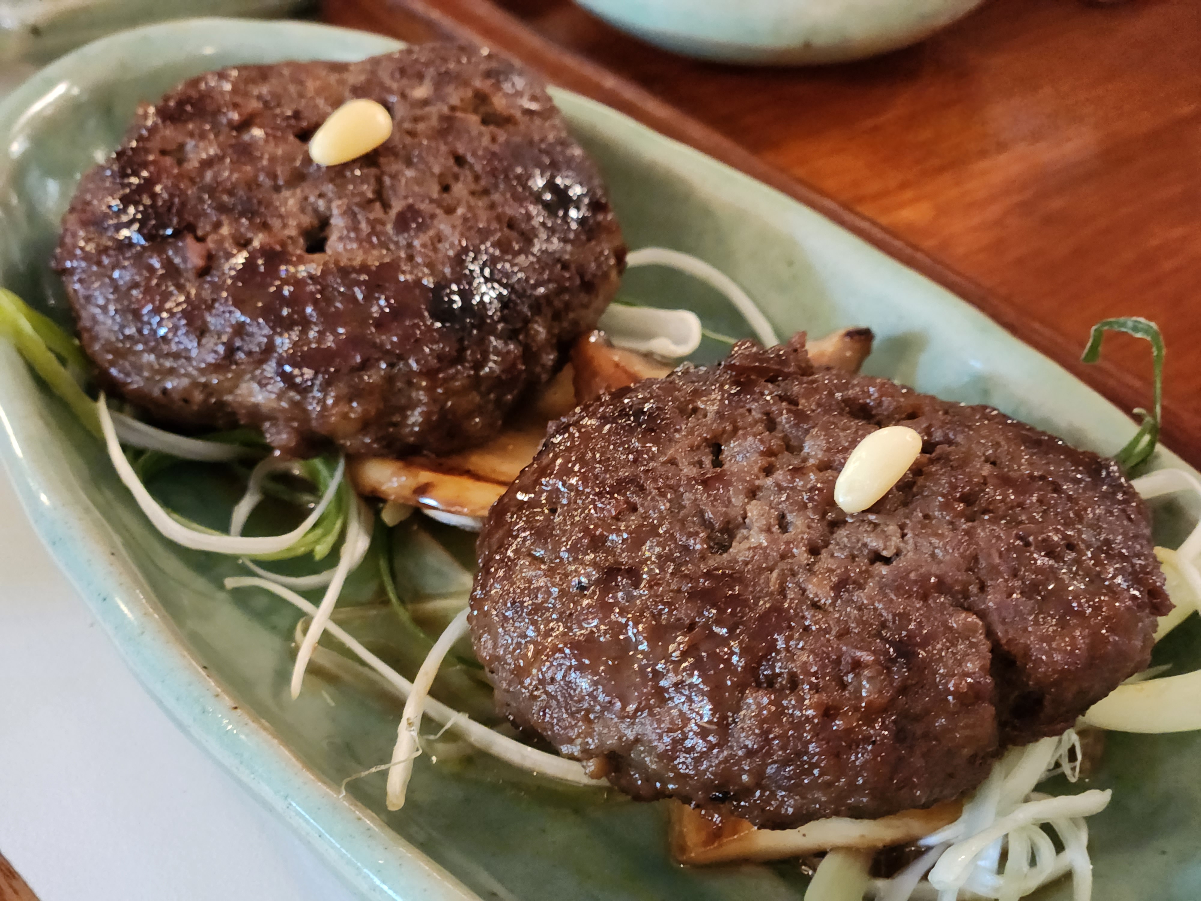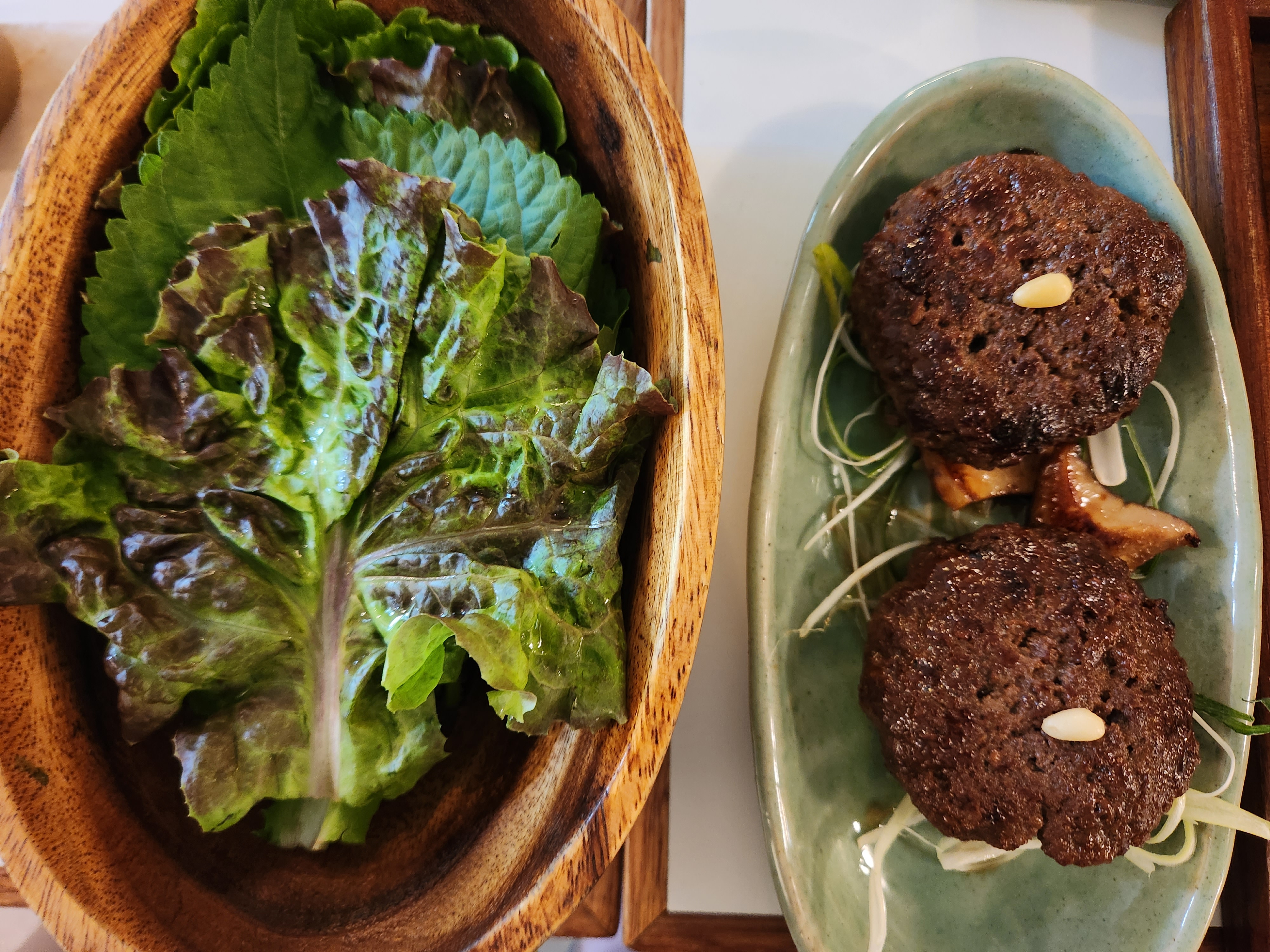 두툼한 한우떡갈비는 고기육즙이 베어나와 달콤함과 고소함이 어우러져 입맛돋궈준다 밑에 깔려진 패채와 함께 먹어도 굿