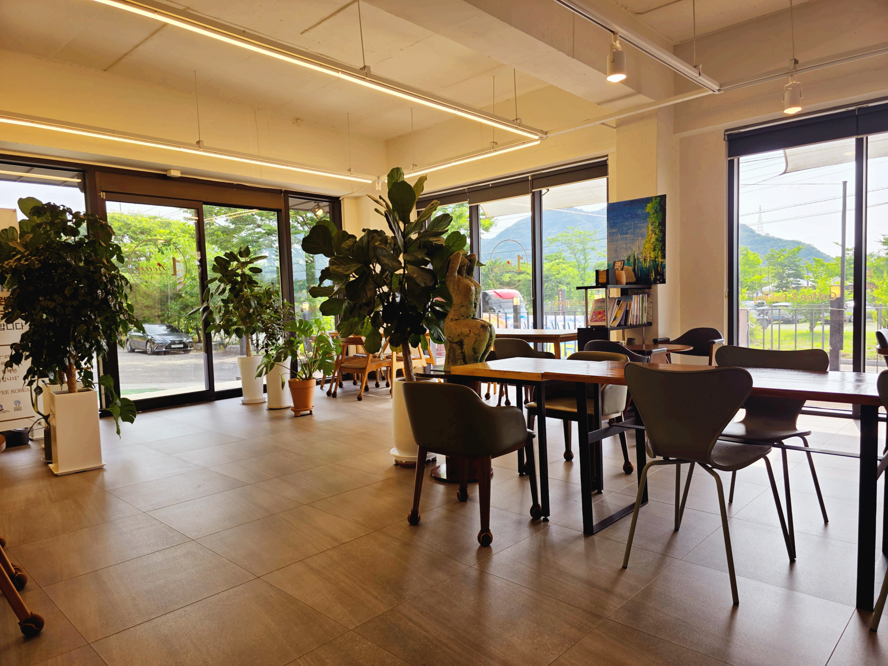 여러 개의 식물들이 배치되어 있어 아늑한 분위기를 자아내고, 편안한 의자와 테이블이 마련되어 있어 친구들과의 대화나 혼자서 책을 읽기에도 좋은 환경이에요.