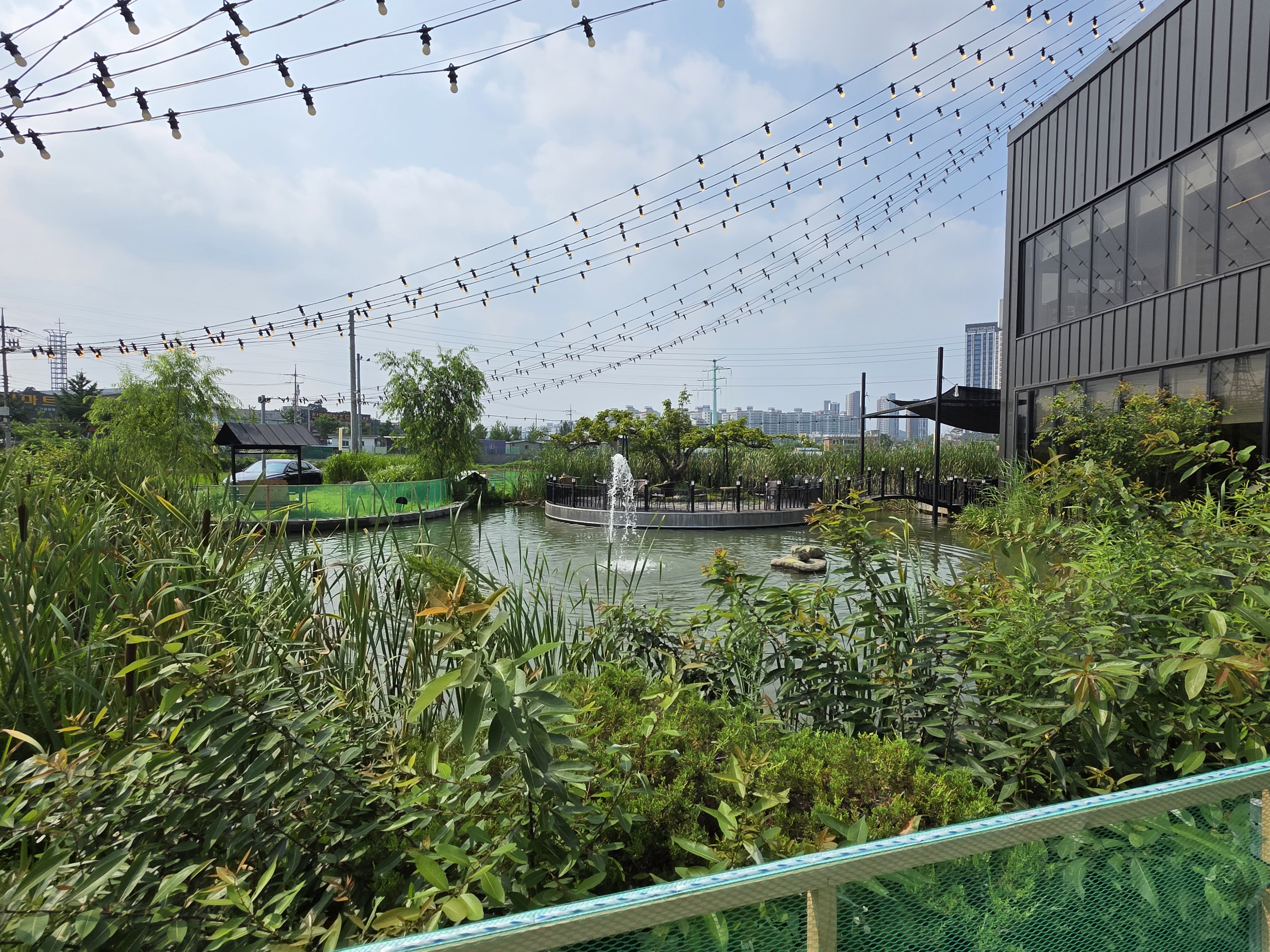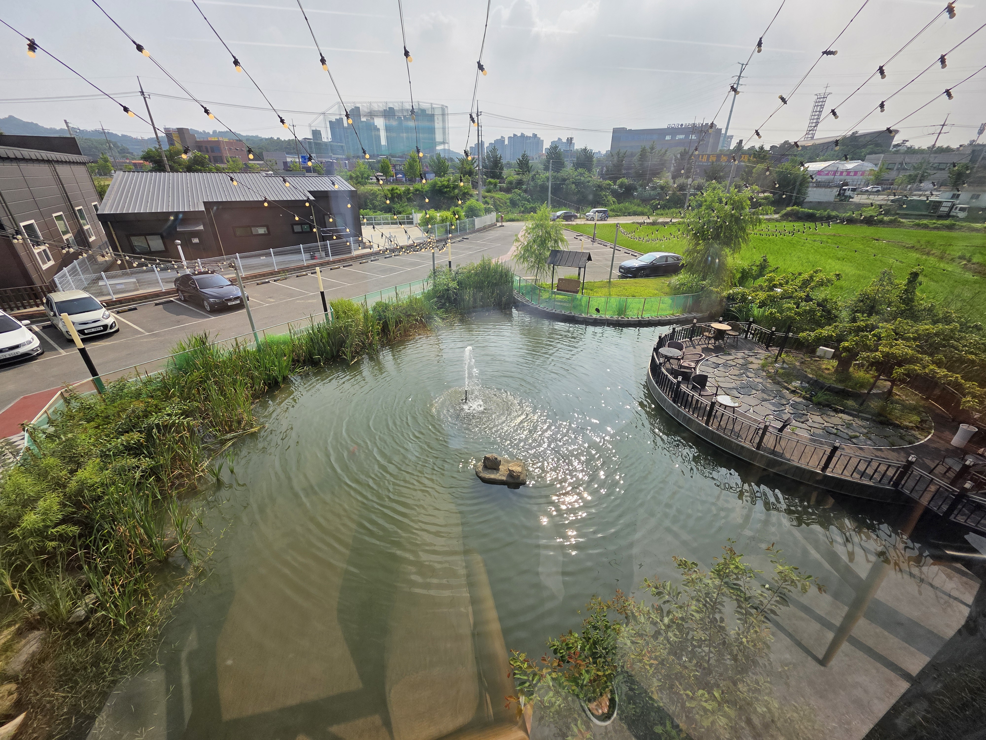 메뉴 주문하고 이층 올라가기 전에 1층에서 바라보는 인공호수 한번 바라봐줬더니