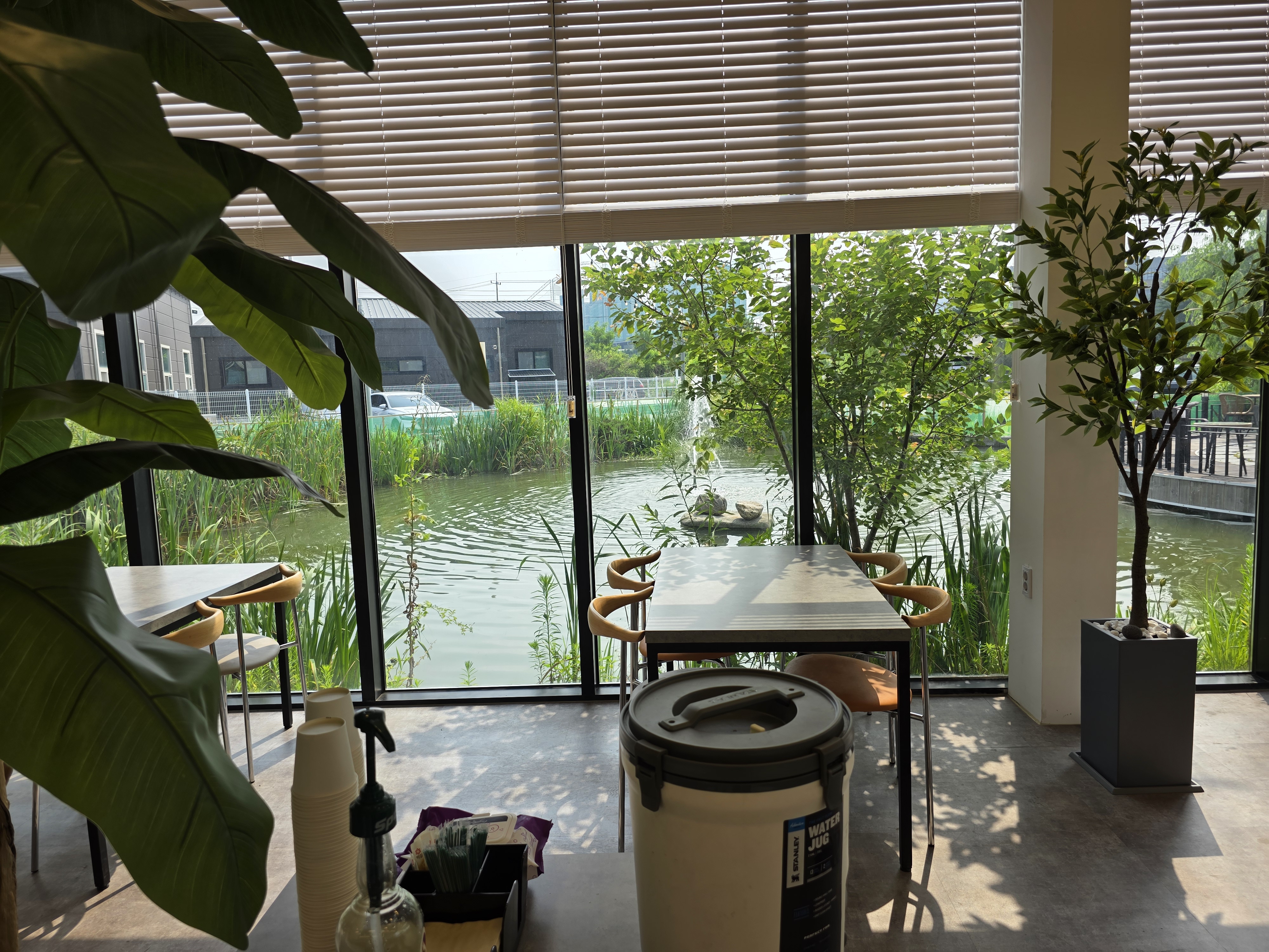 주변에 연못과 조경이 잘 되어 있어서, 자연을 느끼며 커피 한 잔을 즐기기 딱 좋은 곳이에요.